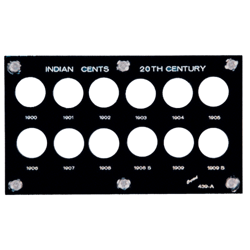 This 12 port Capital Plastic coin case holds the 12 20th Century Indian Cent Cents 1900-1909. The text at the top of the case reads Indian Cents 20th Century. This case is held together by 6 posts and matching screws that are installed through the top and bottom layers of this case.