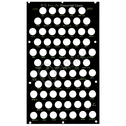 This 8"x14" Capital Plastic coin case holds Lincoln Memorial Cent dated from 1959 through 1979 in one single board. There are ports for P,D,S BU and the S Proofs. The title at the top of the case says 1959 U.S. Lincoln Memorial Cents 1979. Each of the ports have the mint and year listed. The case has a top and bottom layer and is held together using 10 post and screws.