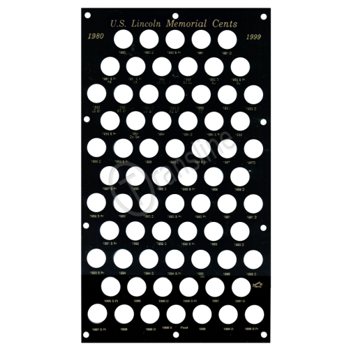 This 8"x14" Capital Plastic coin case holds Lincoln Memorial Cent dated from 1980 through 1999 in one single board. There are ports for P,D and the S Proofs. The title at the top of the case says 1980 U.S. Lincoln Memorial Cents 1999. Each of the ports have the mint and year listed. The case has a top and bottom layer and is held together using 10 post and screws.
