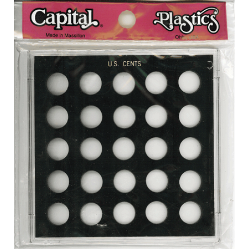 This 25 port Galaxy Capital Plastic coin case is perfect to hold up to 25 Pennies all in one single board. The title at the top of the case says U.S. Cents. None of the ports have labels. The molded plastic case snaps together so there are no need for any no screws to keep it closed.