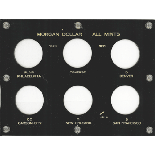 This Capital Plastic Holder has 6 ports to hold your Morgan Dollar Collection. At the top of this holder, The printing in gold reads Morgan Dollar All Mints. The back of this holder is Black.