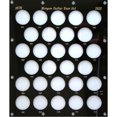 This Capital Plastic Holder has 28 ports to hold your Morgan Dollar Year Set Collection. At the top of this holder, The printing in gold reads Morgan Dollars Year Set and ports are dated from 1878-1921. The back of this holder is Black.