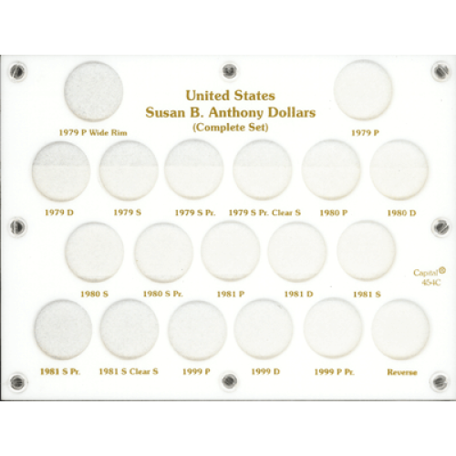 This Capital Plastic Holder has 19 ports to hold your complete SBA Dollar Collection. At the top of this holder, The printing in gold reads United States, Susan B. Anthony Dollars, Complete Set. All of the ports are dated. The back of this holder is White. Size: 6x8