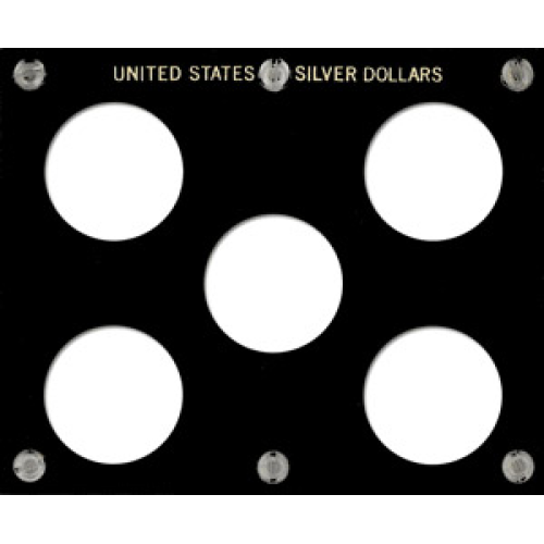 This Capital Plastic Holder has 5 ports to hold your US Silver Dollar Collection. At the top of this holder, The printing in gold reads US Silver Dollars and all of the ports are blank. The back of this holder is Black. Size: 5x6