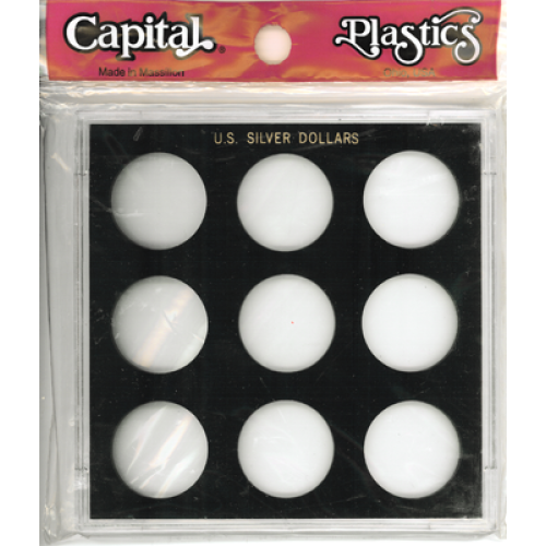 This Capital Plastic Holder has 9 Blank ports to hold your US Silver Dollars Collection. At the top of this holder, the gold printing reads, US Silver Dollars. The back of this holder is Black.