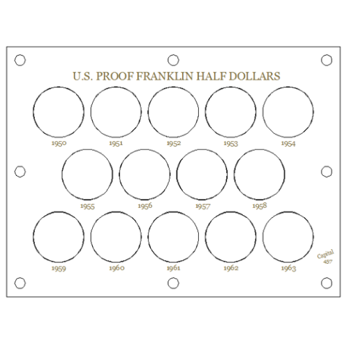 This Capital Plastic Holder has 14 ports to hold your US Franklin Half Dollar Collection. At the top of this holder, The printing in gold reads US Proof Franklin Half Dollar and all of the ports are labeled from 1950-1963. The back of this holder is White.