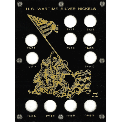 This Capital Plastic Holder has 11 slots all dated from 1942 through 1945 S with ports for the P, D and S Mints . This holder stays firmly closed with 6 posts and screws mounted around the edge of the holder. The background of this holder is black. The title at the top of the holder says "U.S. WARTIME SILVER NICKELS" with image depicting Raising the Flag on Iwo Jima. To see exactly which mint marks this item covers click on the image at the left for a larger view. Size: 6x8"
