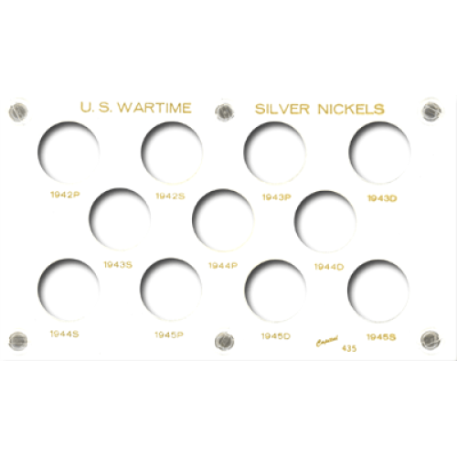 This Capital Plastic Holder has 11 slots all dated from 1942 through 1945 S with ports for the P, D and S Mints . This holder stays firmly closed with 6 posts and screws mounted around the edge of the holder. The background of this holder is White. The title at the top of the holder says "U.S. WARTIME SILVER NICKELS". To see exactly which mint marks this item covers click on the image at the left for a larger view. Size: 3.6x6"