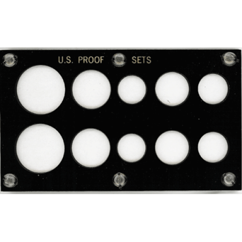 This 3.5x6in Capital Plastic Holder is for a 2x 5 Coin Proof Sets which have a place for the Half Dollar, Quarter, Dime, Nickel and Cent (from left to right). The top of the holder says U.S. Proof Sets and has a total of 10 slots for your coins. The background color of this large capital holder is black.