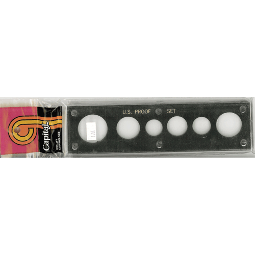 This 2x7.5 in Capital Plastic Holder is for a 6 coin US Proof set which has a place for a Half, Quarter, Dime, Nickels, Cent and one Small Dollar (Sacagawea, Susan B Anthony or Presidential) from left to right. The top of the holder says "U.S. PROOF SET" in gold and is contrasted with a black background.