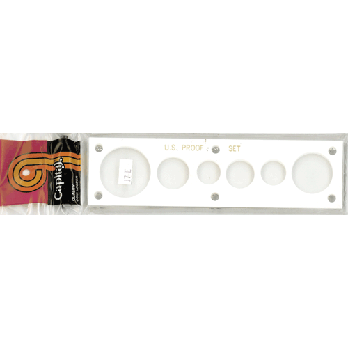 This 2x7.5 in Capital Plastic Holder is for a 6 coin US Proof/Mint/Year set which has a place for an Eisenhower / Morgan or even Peace Dollar, Quarter, Dime, Nickels, Cent and Half Dollar from left to right. This holder has NO text printed on it and has a White background.