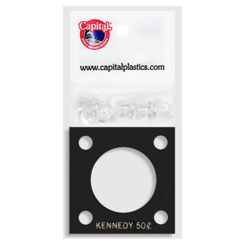 Capital Plastics 2x2 Kennedy Half 144 Screw Type Holder with plastic layers. Color is Black. The text on the holder reads "KENNEDY 50c".