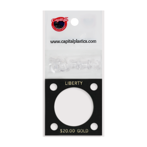 Capital Plastics 2x2 Liberty $20.00 Gold 144 Screw Type Holder with plastic layers. Color is Black. Text on the holder says "Liberty $20.00 Gold".
