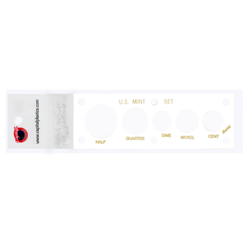 This 2x6in Capital Plastic Holder is for a 5 Coin US Mint set which has a place for the Half, Quarter, Dime, Nickel and Cent (from left to right). The top of the holder says "UNITED STATES MINT SET", the bottom has each coin size printed all in gold and is contrasted with a white background.
