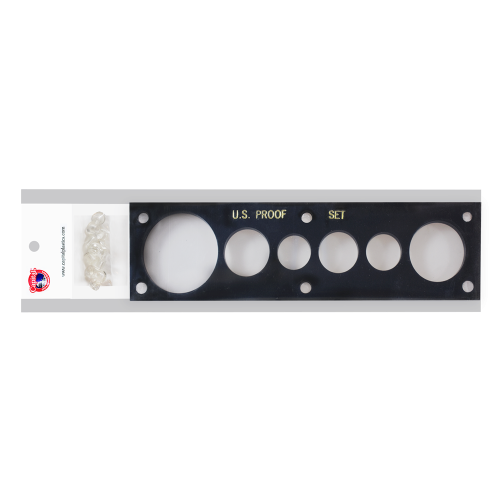 This 2x7.5 in Capital Plastic Holder is for a 6 coin US Mint set which has a place for a Half, Quarter, Dime, Nickels, Cent and one American Silver Eagle (ASE) Dollar from left to right. The top of the holder says "U.S. MINT SET" in gold and is contrasted with a black background.