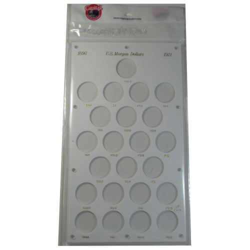 This Capital Plastic Holder has 25 ports to hold your Morgan Dollar Collection from 1898O-1921S. At the top of this holder, the gold printing reads, US Morgan Dollars. The back of this holder is White.