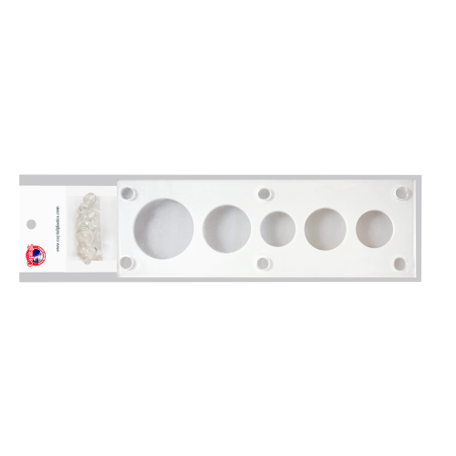 This 2x6in Capital Plastic Holder is for a 5 Coin US Proof set which has a place for the Half, Quarter, Dime, Nickel and Cent (from left to right). There is no text anywhere on this white holder.