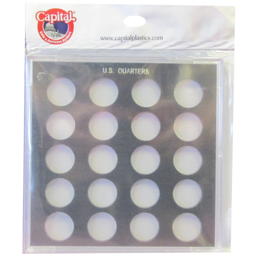 This snap-lock style Galaxy Capital Plastic Holder has 20 Quarter ports. The only printing on this holder is at the top in gold it says "US Quarters". The background of this The back of this holder is black.