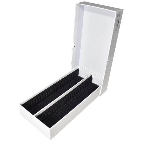Double Row Glossy white paperboard box with velour flocked interior slots to snugly hold 50 Guardhouse 1 oz bar capsules. Also works with Airtite size and Coinsafe 1 oz bar holders. Bars sit in horizontally