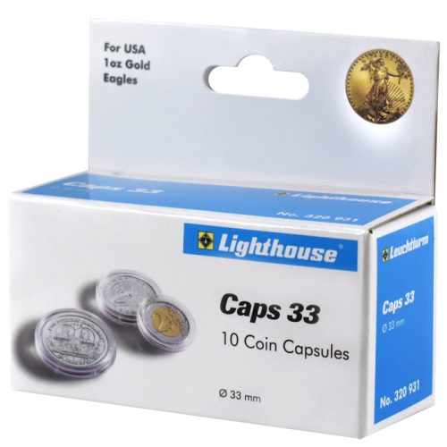 These round Lighthouse Brand 33mm Coin Capsules come in a package of 10 and are crystal clear for U.S. and foreign coins.