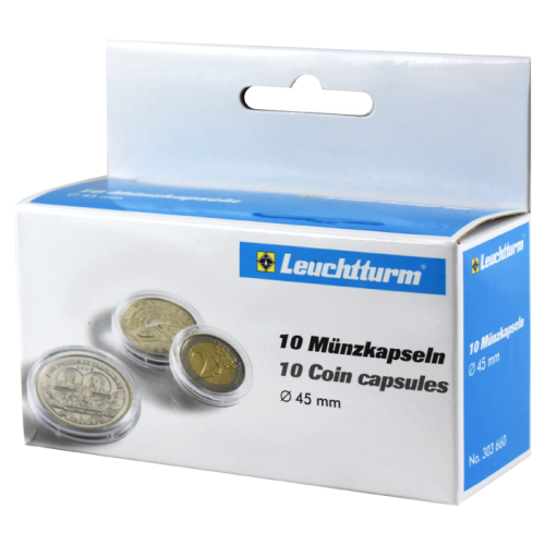 These round Lighthouse Brand 45mm Coin Capsules come in a package of 10 and are crystal clear for U.S. and foreign coins.