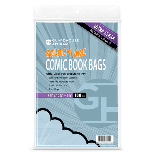 Resealable bag accomodates Golden Age comic books published in the 40s and 50s in the 7.125 to 7.5 x 10.25 inch size range. Many comic books printed from the 1940s and 50s, and some through the early 1960s work with this bag. 2 mil ultra clear polypropylene Resealable strip on body of bagAccommodation range from 7.125 to 7.5 x 10 1/8 sizesInterior size is 7.75 x 10.5Polypropylene is an inert, stable, PVC-Free materialIdeal protections against dust and moisture during handling and storage100 per pack !