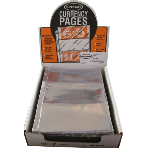 These Supersafe 3 Pocket Pages are made to fit in any standard size 3 ring binder and hold your Large Currency pages. All 100, 3 Pocket Pages are packed in an attractive display box. Supersafe standard vinyl coin and currency notebook pages offer name brand, quality storage for currency holder and flips.