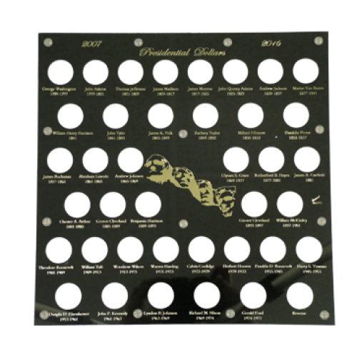 This Capital Plastic Holder has 39 ports to hold your Complete Presidential Dollar Collection from 2007-2016. At the top of this holder, the gold printing reads, Presidential Dollars and has a featured picture of Mount Rushmore. Each Port is labeled with a president and date. The back of this holder is Black.
