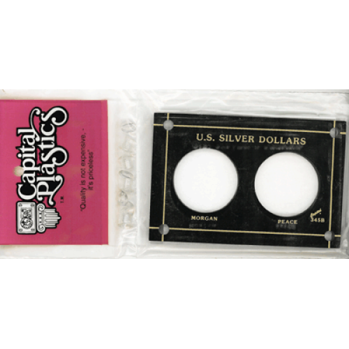 This Capital Plastic Holder has 2 ports to hold 1 Morgan Dollar and 1 Peace Dollar. At the top of this holder, the gold printing reads, US Silver Dollars. Each Port is labeled with Morgan and Peace. The back of this holder is Black.