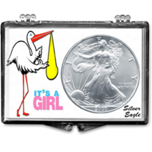 This Edgar Marcus snap lock is made to hold your American Silver Eagle ASE. This coin holder is titled It's a Girl and features a stork.