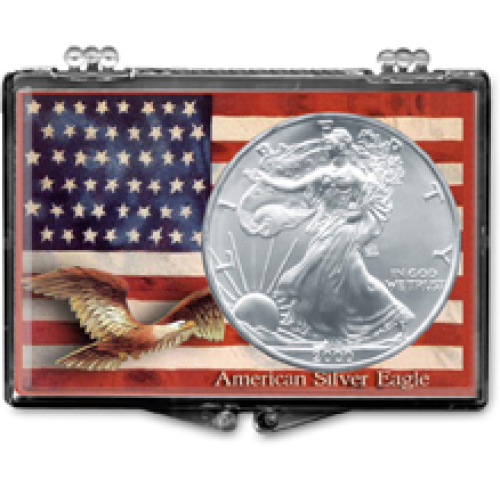This Edgar Marcus snap lock is made to hold your American Silver Eagle ASE. This coin holder features an American Eagle with an American Flag background.