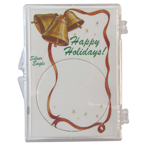 This Edgar Marcus snap lock is made to hold your American Silver Eagle ASE. This coin holder is titled Happy Holidays and features a beautiful ribbon and bells design.