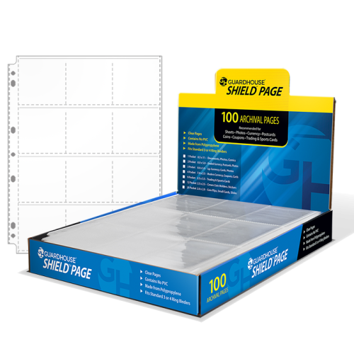 This Guardhouse Shield page is made out of Polypropylene and are 100% archival. Packed in an attractive display box, these 12 pocket pages are made to fit any standard size 3 ring binder and is perfect for to hold and protect 2 1/2 x 2 1/2 photographs, coins, paper holders, flips. Guardhouse Shield pages are thinner, stronger and less susceptible to tearing and stretching... At a fraction of the price!