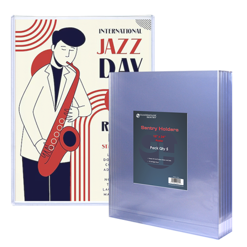 Crystal clear viewing of 18x24 documents such as posters or art Keep your art, posters, or other memorabilia clean and safe Pack of 5 18x24 poster size document holders per box 12 mil thickness means better protection than other sleeves in the market All-new sealed poster size topload holders Protective sleeve toploaders are essential items when collecting photos. Sold in packs of 5, art size Guardhouse toploaders are 12 mil thick and measure 18 x 24 inches. Guardhouse toploaders are made of non-plasticized rigid vinyl and are designed to keep photos unharmed during long-term storage, at the same time as offering the collector great visibility of their collectible items.