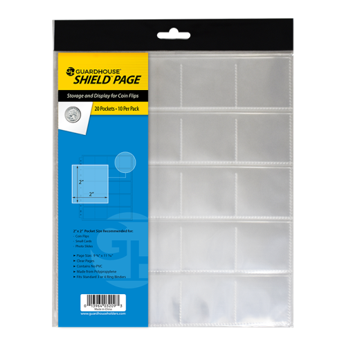 This Guardhouse Shield page is made out of Polypropylene and are 100% archival. This 20 pocket page is made to fit any standard size 3 ring binder and is perfect for to hold and protect 2 x 2 coins, paper holders, flips. Guardhouse Shield pages are thinner, stronger and less susceptible to tearing and stretching... At a fraction of the price!