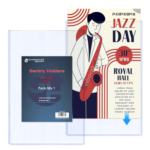 Crystal clear viewing of 24x36 documents such as posters or art Keep your art, posters, or other memorabilia clean and safe Individual pack of 1 24x36 poster size topload holder 12 mil thick sleeves provides better protection than other sleeves in the market All-new sealed poster size topload holder Protective sleeve toploaders are essential items when collecting and saving posters or photos. Sold individually, Guardhouse 24x36 toploaders are 12 mil thick and measure 24 1/8 x 36 15/16 inside, while the outside measures 24 5/8 x 36 3/16 inches. Guardhouse toploaders are made of non-plasticized rigid vinyl and are designed to keep posters and photos unharmed during long-term storage, at the same time as offering the collector great visibility of their collectible items.