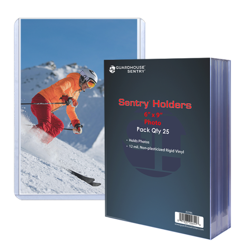 Crystal clear viewing of 6x9 photos and postcards Keep your photos and postcards clean and safe Pack of 25 photograph holders per box All-new sealed photo sleeves Protective sleeve toploaders are essential items when collecting and saving postcards or photos. Sold in packs of 25, these Guardhouse toploaders for postcards or photos are 12 mil thick and measure 6 1/16 x 9 inside, while the outside measures 6 5/16 x 9 1/8 inches. Guardhouse toploaders are made of non-plasticized rigid vinyl and are designed to keep photos and cards unharmed during long-term storage, at the same time as offering the collector great visibility of their collectible items.