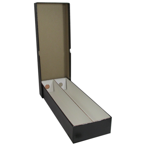 This Guardhouse Double Row Box can store up to 330 coins in 2x2 cardboard and/or Mylar flips. This box is made out of Heavy Duty cardboard and has a Black textured exterior wrap. Guardhouse provides you with superior quality at a great price!
