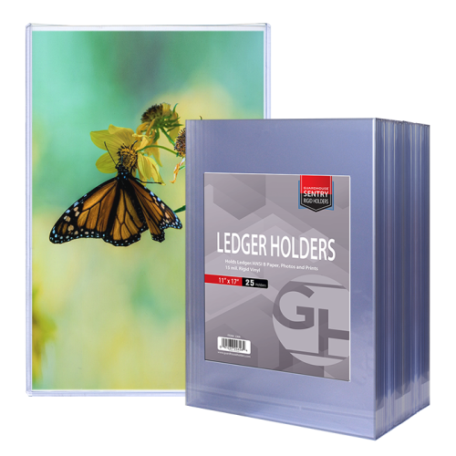 Crystal clear viewing of 11x17 documents such as newspapers, photos, or lithographs Keep your documents or other memorabilia clean and safe Pack of 25 11x17 ledger size document holders per box All-new sealed ledger size sleeves Protective sleeve toploaders are essential items when collecting and saving lithographs or photos. Sold in packs of 25, these Guardhouse toploaders for lithographs and photos are 12 mil thick and measure 11 2/16 x 14 inside, while the outside measures 11 8/16 x 14 1/4 inches. Guardhouse toploaders are made of non-plasticized rigid vinyl and are designed to keep lithographs and photos unharmed during long-term storage, at the same time as offering the collector great visibility of their collectible items.