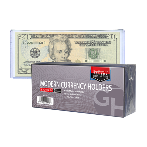 Crystal clear viewing of 2 3/4 x 6 1/4 currency Keeps currency notes clean and safe Pack of 25 per box All-new sealed 12 mil thick Long term storage safe! Protective currency sleeve toploaders are essential items when collecting and saving modern currency bills. Sold in packs of 25, Guardhouse toploaders for modern currency are 12 mil thick and measure 2 3/4 x 6 1/4 inside, while the outside measures 2 7/8 x 6 9/16 inches. Guardhouse toploaders are made of non-plasticized rigid vinyl and are designed to keep currency bills unharmed during long-term storage, at the same time as offering the collector great visibility of their bills. Using Guardhouse sleeves is a great storage solution for your money.