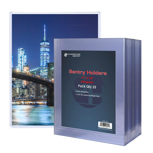 Crystal clear viewing of 11x14 documents such as newspapers or lithographs Keep your documents or other memorabilia clean and safe Pack of 25 newspaper size memorabilia and other document holders per box All-new sealed newspaper and lithograph size sleeves Protective sleeve toploaders are essential items when collecting and saving lithographs or photos. Sold in packs of 25, these Guardhouse toploaders for lithographs and photos are 12 mil thick and measure 11 2/16 x 14 inside, while the outside measures 11 8/16 x 14 1/4 inches. Guardhouse toploaders are made of non-plasticized rigid vinyl and are designed to keep lithographs and photos unharmed during long-term storage, at the same time as offering the collector great visibility of their collectible items.