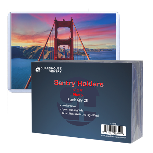 Crystal clear viewing of 4x6 photos and postcards Keep your photos and postcards clean and safe Pack of 25 per box All-new sealed photo sleeves Protective sleeve toploaders are essential items when collecting and saving postcards or photos. Sold in packs of 25, these Guardhouse toploaders for postcards or photos are 12 mil thick and measure 4 1/8 x 6 1/8 inside, while the outside measures 4 1/4 x 6 5/16 inches. Guardhouse toploaders are made of non-plasticized rigid vinyl and are designed to keep photos and cards unharmed during long-term storage, at the same time as offering the collector great visibility of their collectible items. These sleeve toploaders have the opening on the 6 inch side.
