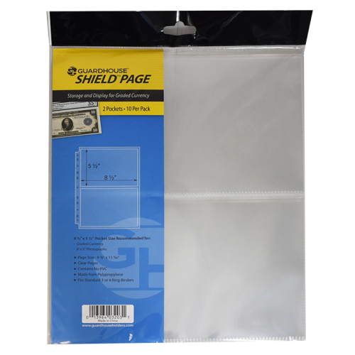 This Guardhouse Shield page is made out of Polypropylene and are 100% archival. This 2 pocket page is made to fit any standard size 3 ring binder and is perfect for to hold and protect 8 x 5 photographs, sport cards, gaming cards, currency. Guardhouse Shield pages are thinner, stronger and less susceptible to tearing and stretching... At a fraction of the price!