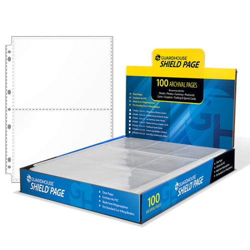 This Guardhouse Shield page is made out of Polypropylene and are 100% archival. This 2 pocket page is made to fit any standard size 3 ring binder and is perfect for to hold and protect 8 x 5 photographs, sport cards, gaming cards, currency. All 100 pages are packaged in a beautiful display box. Guardhouse Shield pages are thinner, stronger and less susceptible to tearing and stretching... At a fraction of the price!