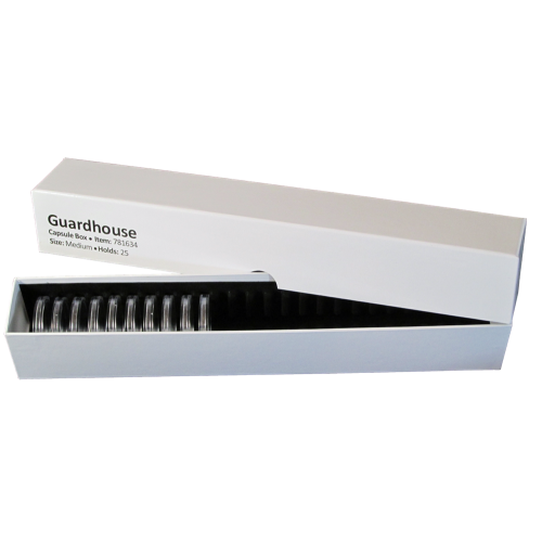These Guardhouse Single Row white chipboard coin capsule storage boxes fit up to 25 Medium Sized Capsules. Each slot is divided by black velour. These dividers help to keep the capsules from rattling and scratching.