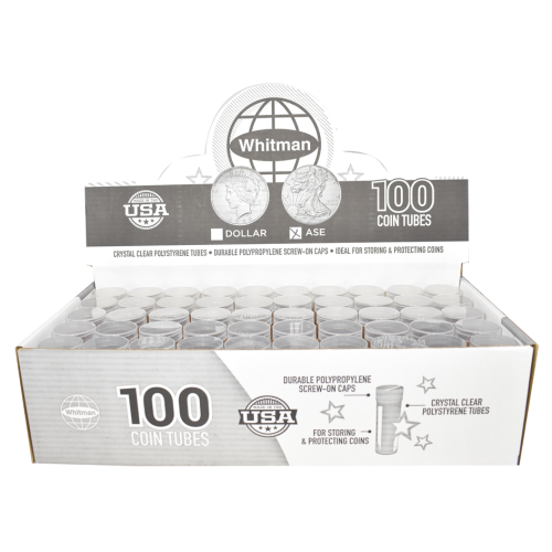 Our price is for a box of 100 American Silver Eagle Dollar (ASE) size Whitman Round Coin Tubes. These tubes are made of crystal clear polystyrene and come with a twist-off cap.