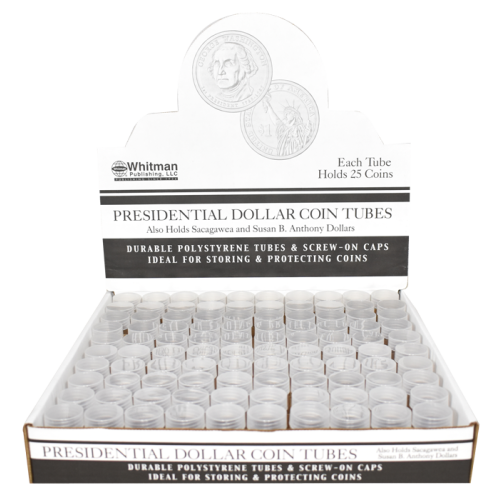 Our price is for a box of 100 Small Dollar size Whitman Round Coin Tubes. Each tube can hold 25 Presidential, Sacagawea, or Susan B Anthony (SBA) dollars. All 3 designs fit in these tubes. These tubes are made of crystal clear polystyrene and come with a twist-off cap.