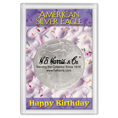 This HE Harris Frosty Case will hold 1 American Silver Eagle Dollar and is not dated. This case design features a delicious frosting with sprinkles background and reads Happy Birthday. Designed for coin display or long-term storage, this product and its inert are made of durable materials that will not harm coins.