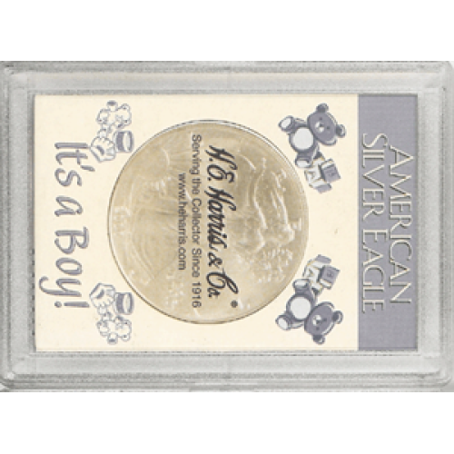This HE Harris Frosty Case will hold 1 American Silver Eagle Dollar and is not dated. This case design features Blue Teddy Bears and Drums and reads It's a Boy! Designed for coin display or long-term storage, this product and its inert are made of durable materials that will not harm coins.
