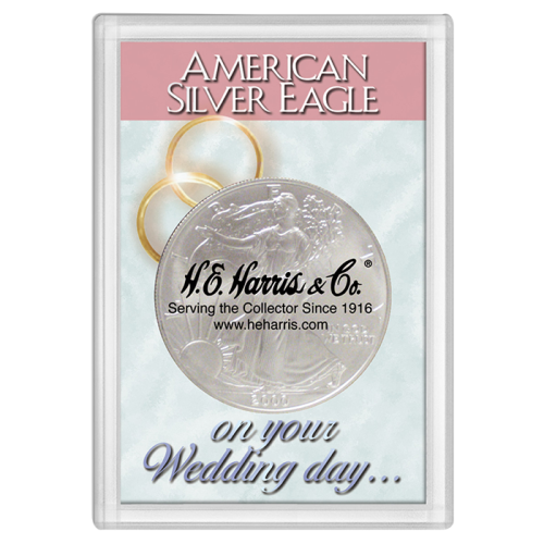 This HE Harris Frosty Case will hold 1 American Silver Eagle Dollar and is not dated. This case design features a pair of wedding rings linked together and reads On your Wedding Day. Designed for coin display or long-term storage, this product and its inert are made of durable materials that will not harm coins.